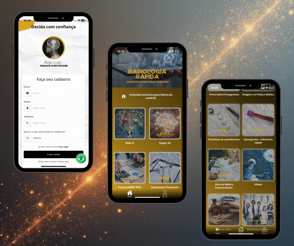A partir dessa pesquisa, nasceu o Raio-X do Interno & Recém-Formado, um aplicativo direto ao ponto, organizado e prático, reunindo exatamente o que internos e médicos de alta performance utilizam no dia a dia, mas raramente explicam: protocolos, condutas, fluxogramas e radiologia aplicada.